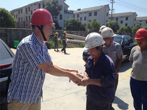 近日氣溫節(jié)節(jié)攀升,酷暑考驗著堅守在浙江東廈公司的一線職工,更牽動著公司領導的心。7月31日,公司領導王董、朱總、施副總等一行帶著防暑降溫慰問品來到嵊州和悅時代廣場悅公館、紹興佳源廣場、濱海新城醫(yī)療器械科技產業(yè)園、柯橋中銀國際大廈等工地現場,親切慰問了堅守在項目部現場的一線職工,詢問他們在高溫天氣下的工作、生活情況,代表公司對一線職工高溫下堅守崗位、辛勞工作表示肯定和感謝,叮囑職工在當前持續(xù)高溫的不利條件下,做好安全工作的同時,要勞逸結合,注意休息,采取有效的防暑措施,安全順利地度過高溫季節(jié),保質保量的完成工作。領導的一聲聲問候和贊譽,給一線的職工送去了盛夏的縷縷清涼,他們紛紛表示要加倍努力工作,保障自身安全,穩(wěn)定生產運行,為建筑工程事業(yè)獻出自己的力量。