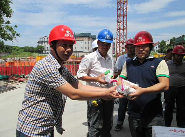 7月16日上午,由公司總經(jīng)理朱衛(wèi)洋,主管質(zhì)量、安全的副總施國明攜同公司工程部員工深入公司在建項目金隆家紡廠房工程施工工地,對工地的全體員工進行高溫慰問,同時對工地質(zhì)量、安全管理進行了例行檢查。工地上熱浪襲人,火熱的驕陽下,建設者們頂著烈日的陽光正抓緊施工,汗水浸透了工作服。公司領導來到工地了解他們生產(chǎn)生活情況,向他們送上清涼慰問品!