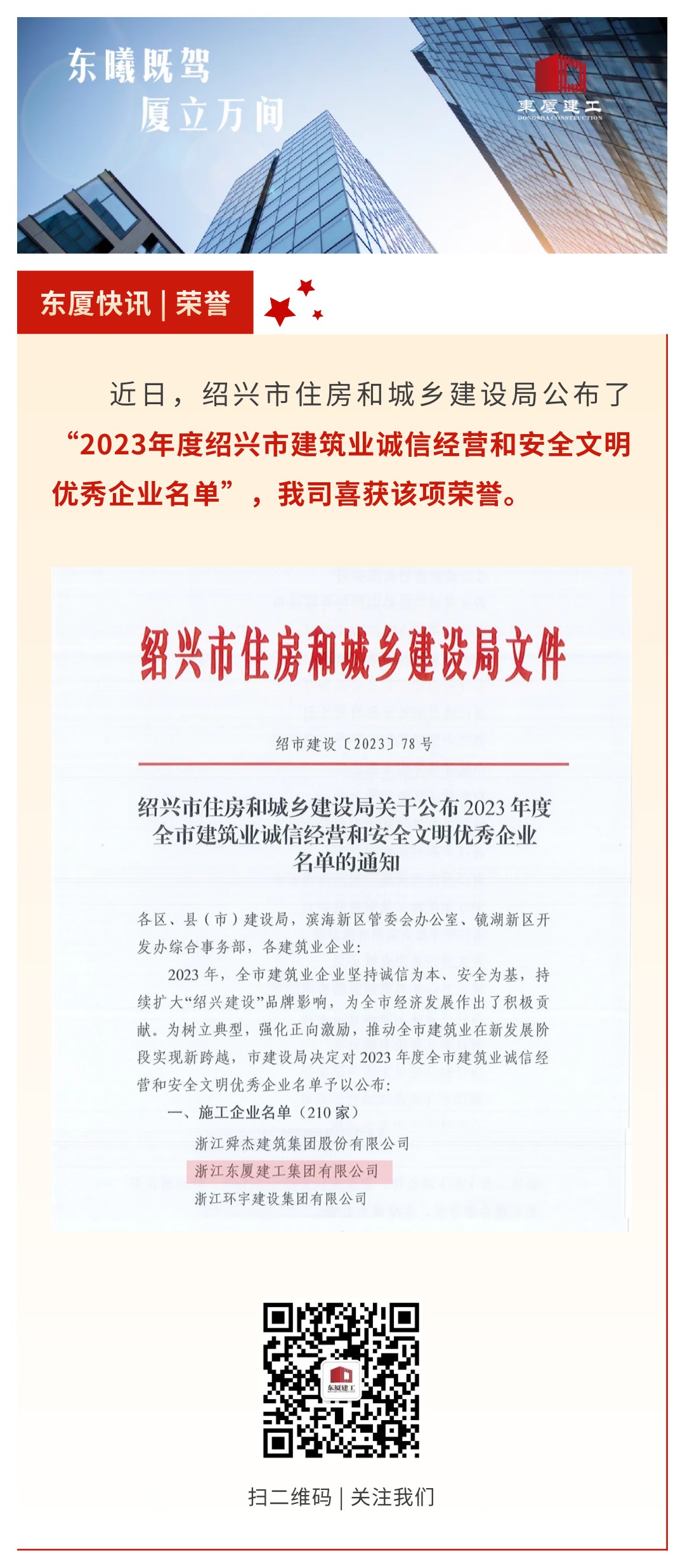 【東廈榮譽】我司榮膺紹興市建筑業(yè)誠信經(jīng)營和安全文明優(yōu)秀企業(yè)稱號